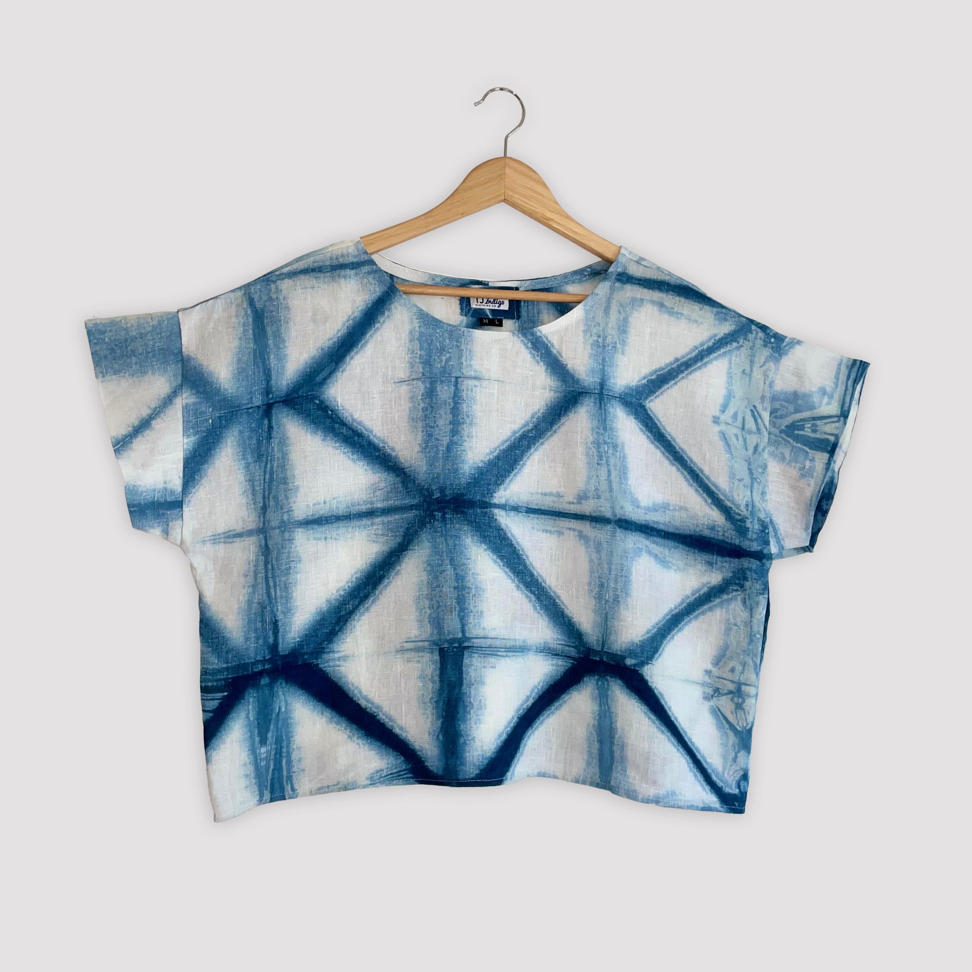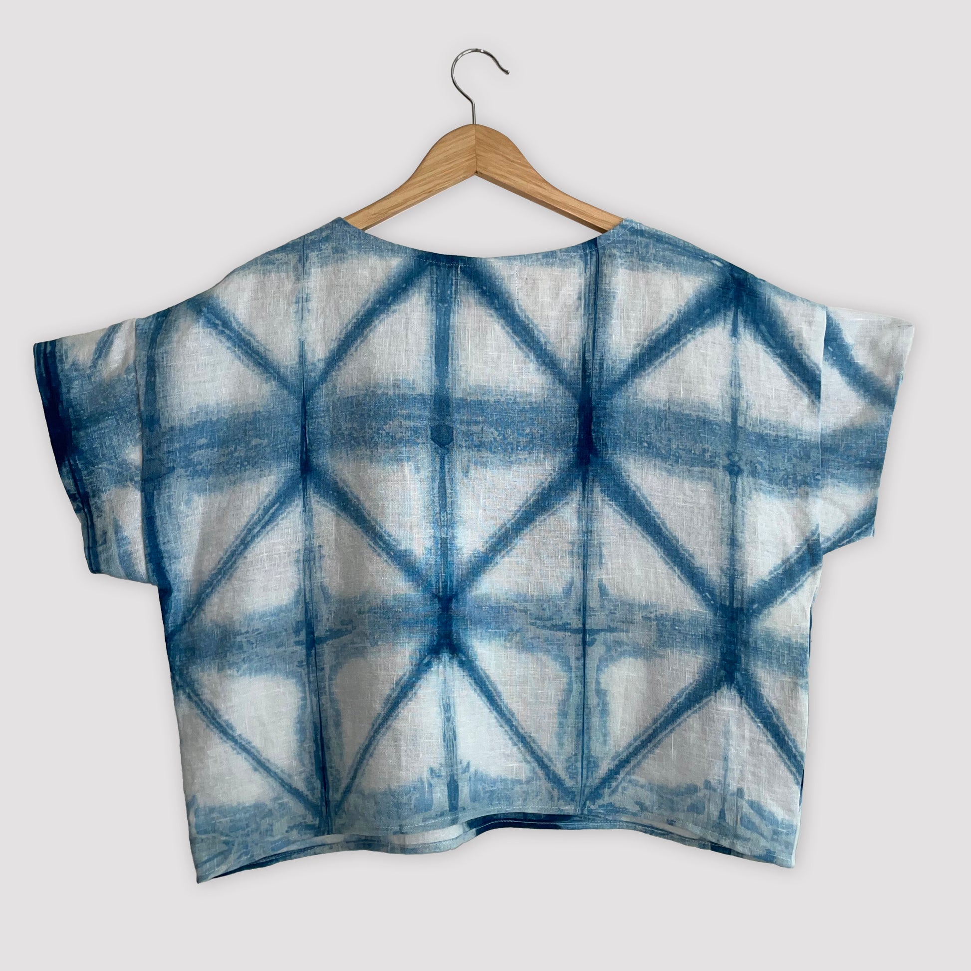 Oversized boxy fit top is crafted from rustic medium weight bright white linen, hand-dyed with natural indigo in high contrast Itajime shibori pattern.