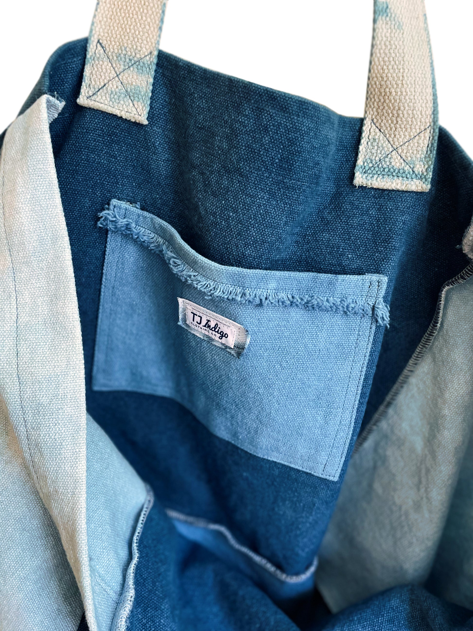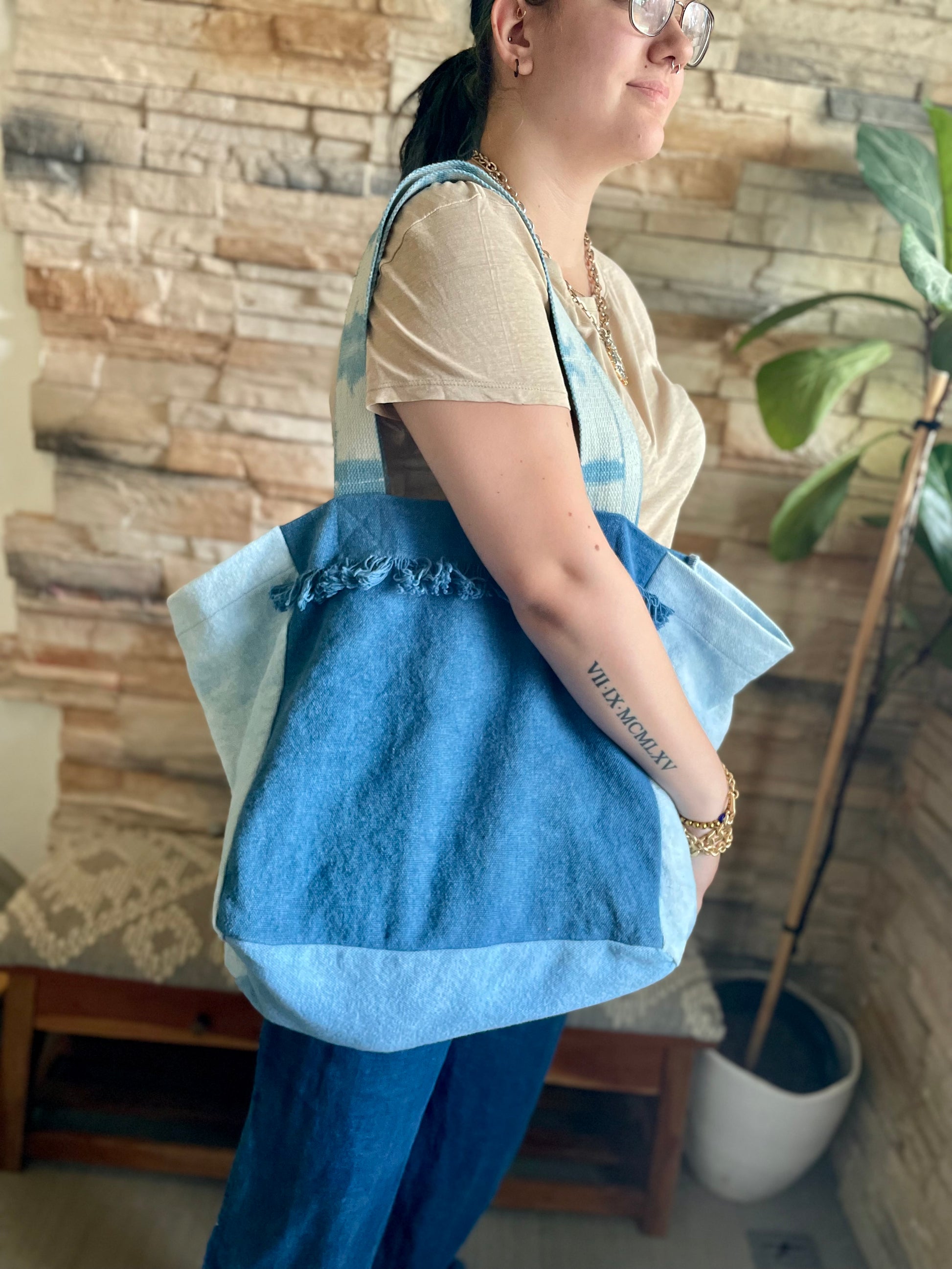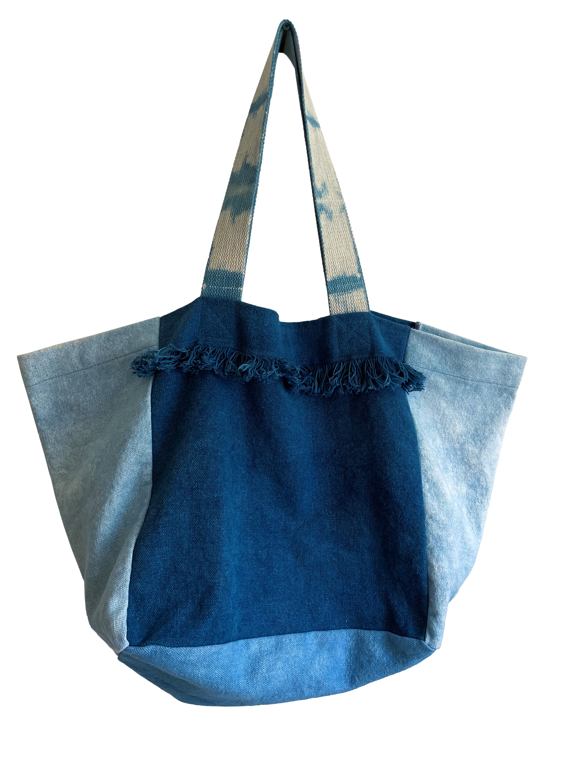 One-of-a-kind, extra large tote bag made from 100% cotton canvas and hand-dyed with plant-based indigo, naturally hypoallergenic and dirt-repellent. Features wide straps, a large inside pocket and fringe.