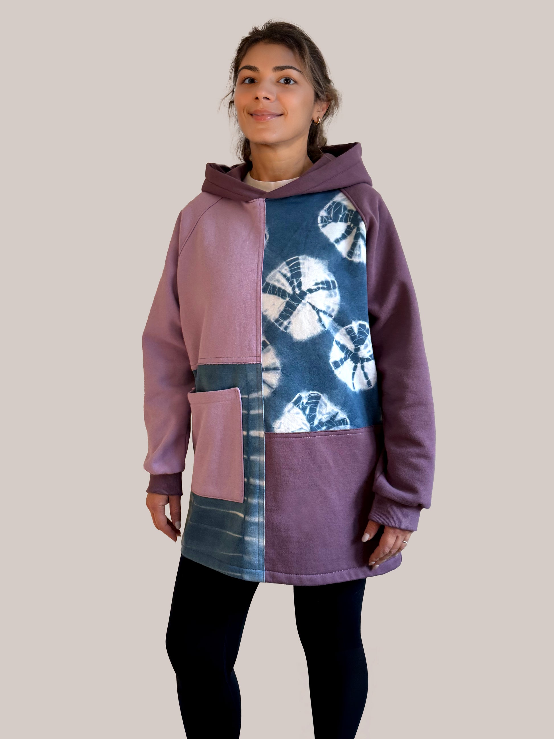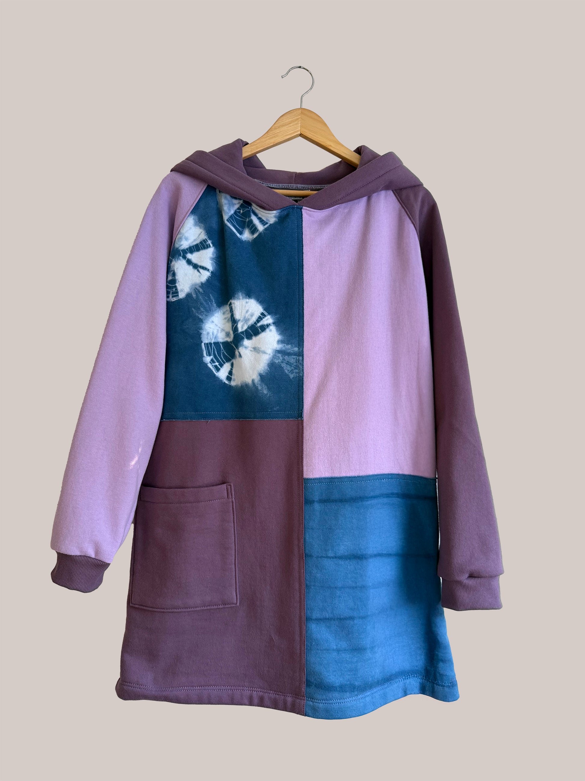 Hooded patchwork sweatshirt dress made from soft 100% cotton fleece with indigo shibori patchwork panels. Designed with a relaxed, easy silhouette, this piece offers warmth without heaviness and a distinctive handmade character. Features raglan sleeves, double-layer hood for added structure and a front patch pocket. Hits below the thigh, offering comfortable coverage and ease when paired with leggings or worn over jeans.