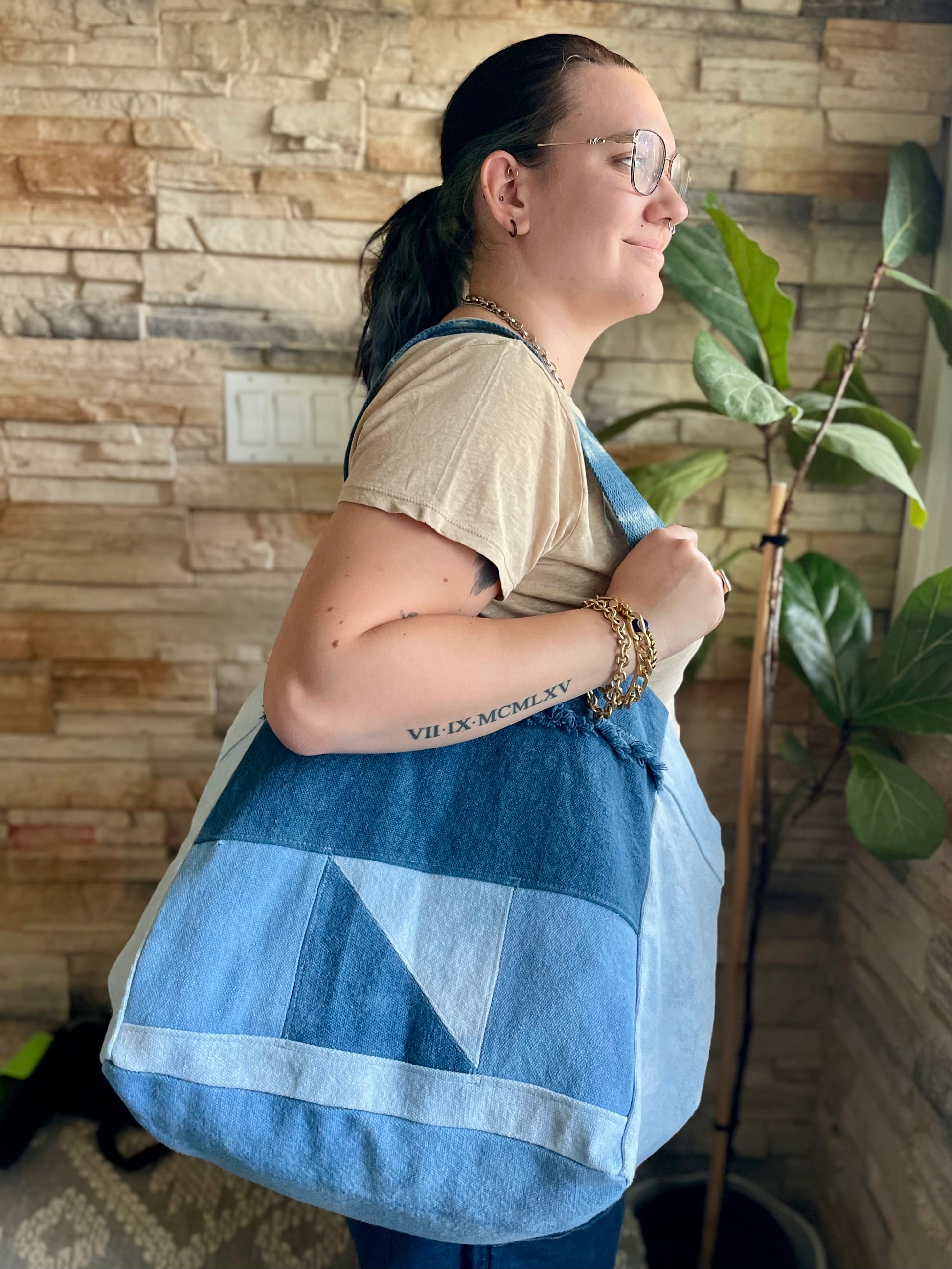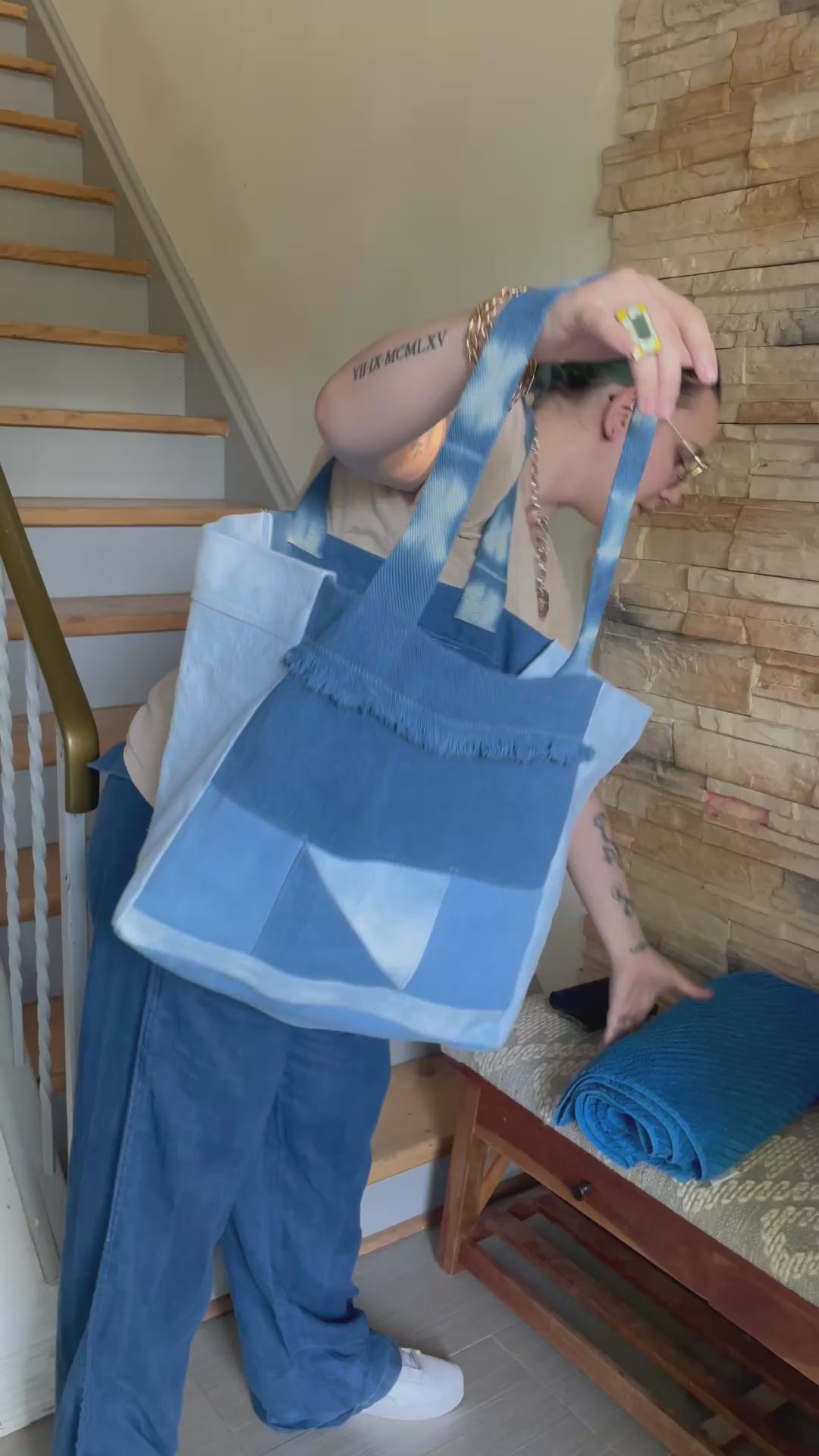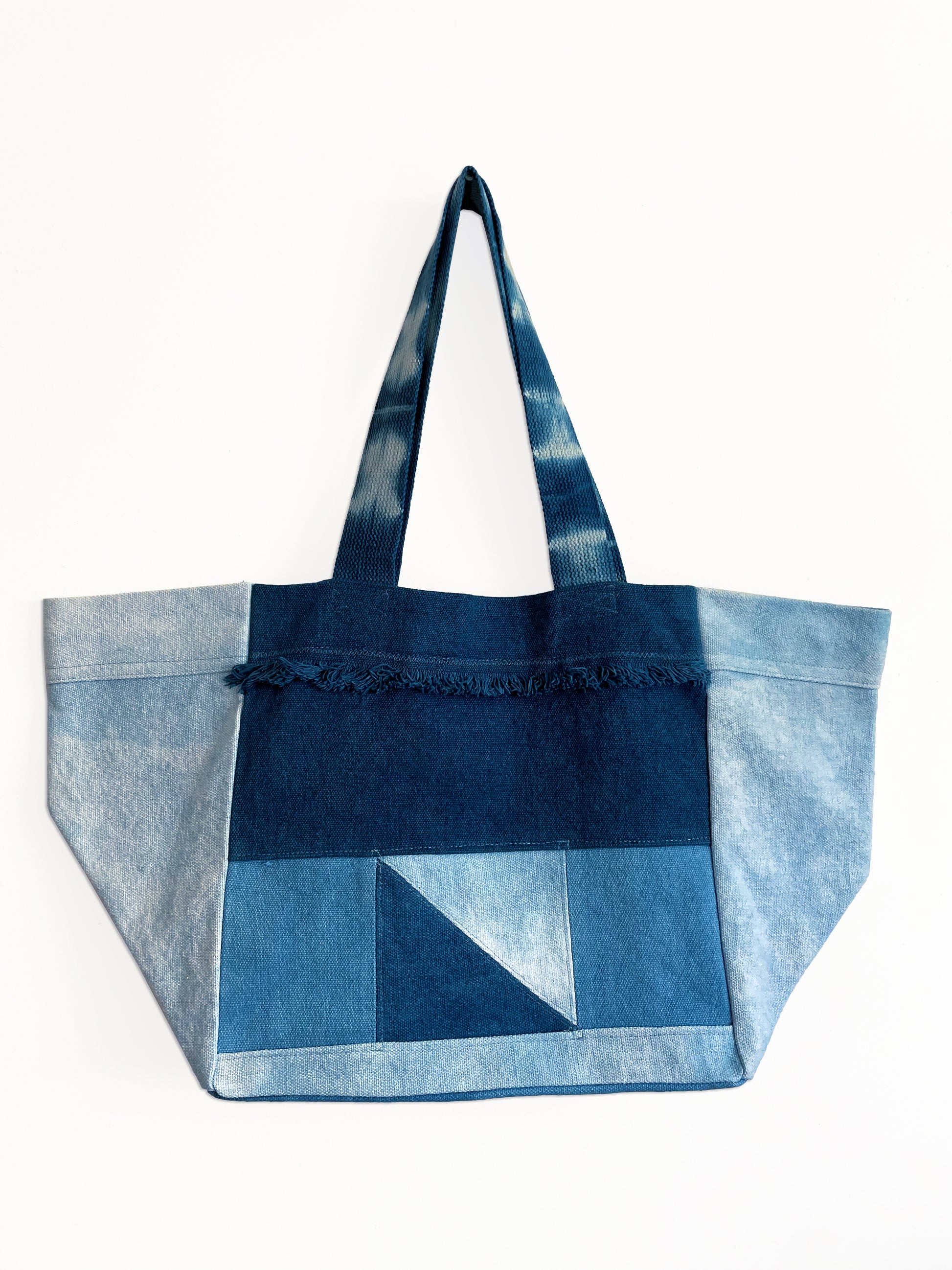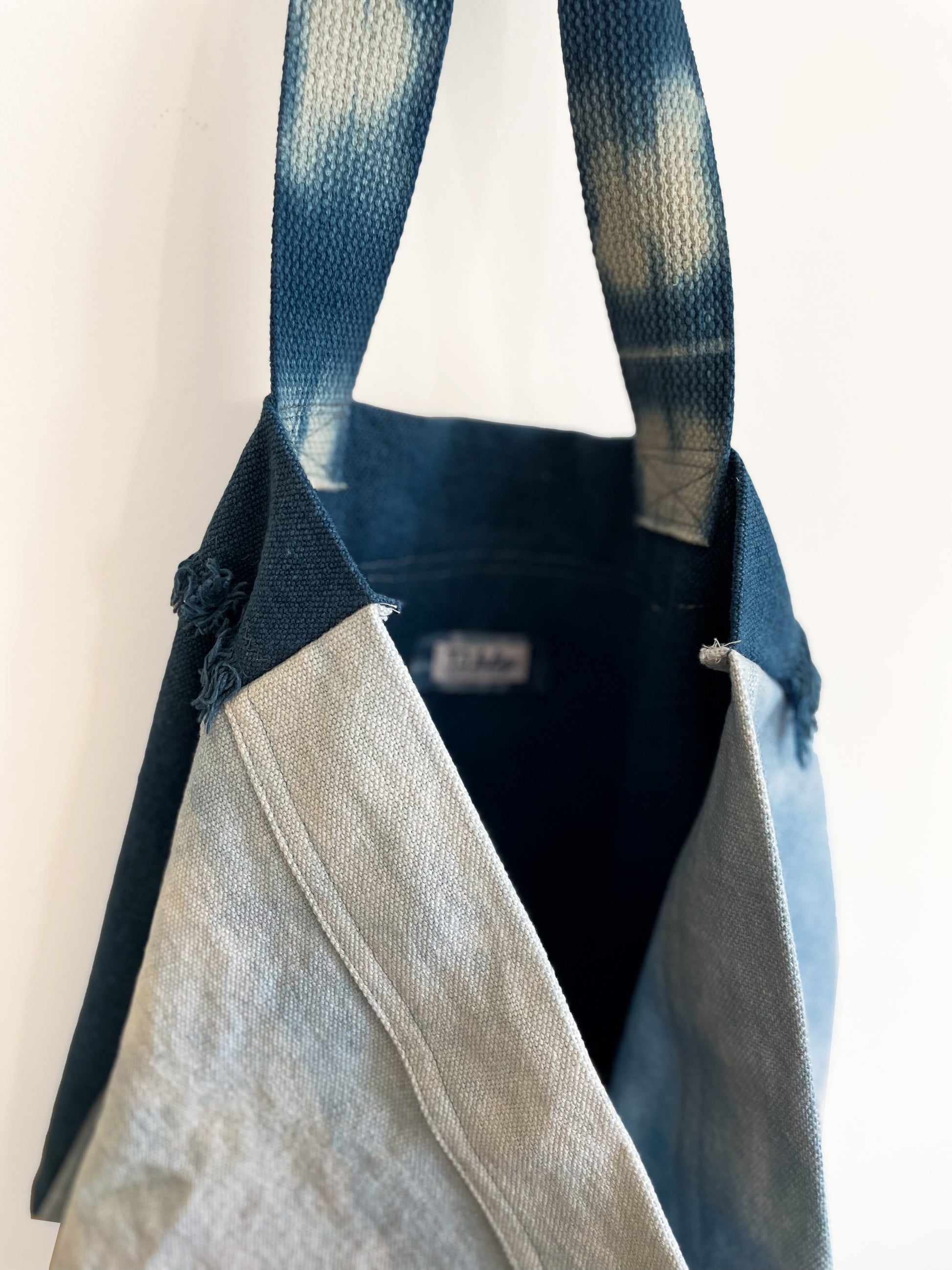 One-of-a-kind, extra large tote bag made from 100% cotton canvas and hand-dyed with plant-based indigo, naturally hypoallergenic and dirt-repellent.